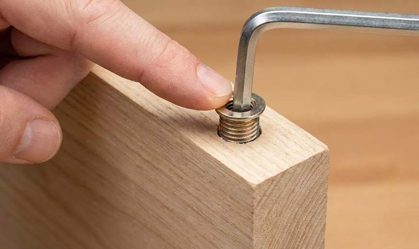 その穴に、鬼目ナットを六角レンチでねじ込んでいきます。鬼目ナットの外側には木材に食い込むための特殊な刃がついており、ガッチリと木材と一体化します。 -
