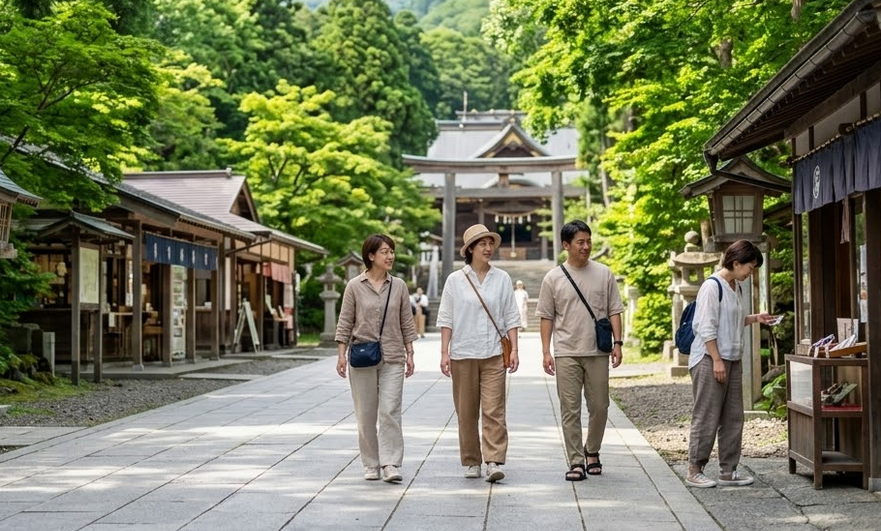 「今日はもうこれ以上は歩きたくないな」と思ったら、無理に神社まで行かなくても、美味しいお蕎麦だけ食べていつでも引き返し、再びケーブルカーで下山できるという、安心感抜群のルートです。