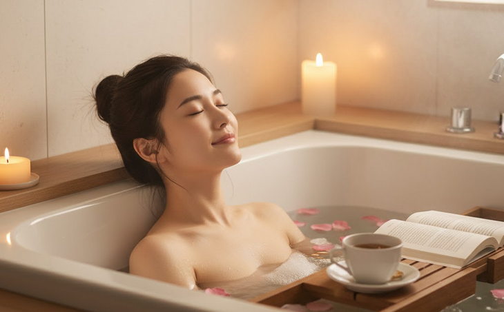 38〜40℃くらいの、あなたが「気持ちいいな」と感じるぬるめのお湯に、15〜20分ほど肩までしっかり浸かります。熱すぎるお湯は交感神経を刺激してしまうので逆効果です。入浴で一時的に上がった深部体温が、お風呂上がりにゆっくりと放熱され、ちょうど90分後に最高の眠気が訪れるという算段です。リラックス効果のあるラベンダーやカモミールのアロマオイルを数滴垂らすのもおすすめです。