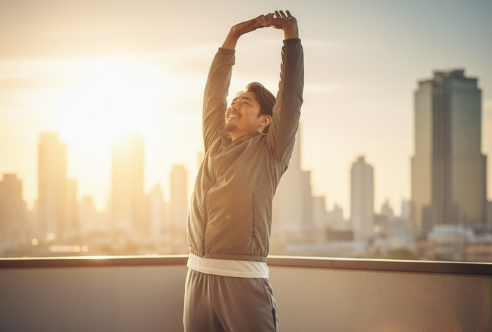 まだ完全に目覚めていない体で、急に立ち上がって活動を始めるのは、寝起きのエンジンにいきなり高負荷をかけるようなもの。まずは布団の中でできる簡単なストレッチで、凝り固まった筋肉をほぐし、全身に血液を送り届けてあげましょう。