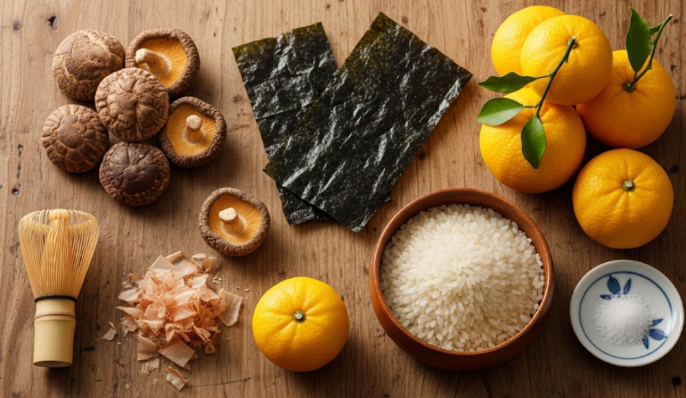 調味料: 料亭の高級な出汁パック、有機栽培のオリーブオイル、木樽で熟成させた醤油など。