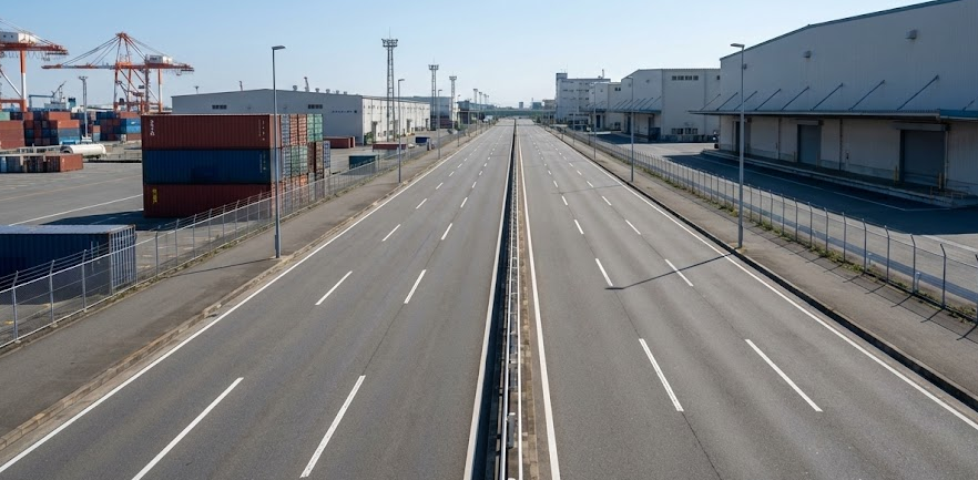 こうした場所は物流の拠点であり、大型トラックが通れるように道路が非常に広く、碁盤の目のように整備されています。