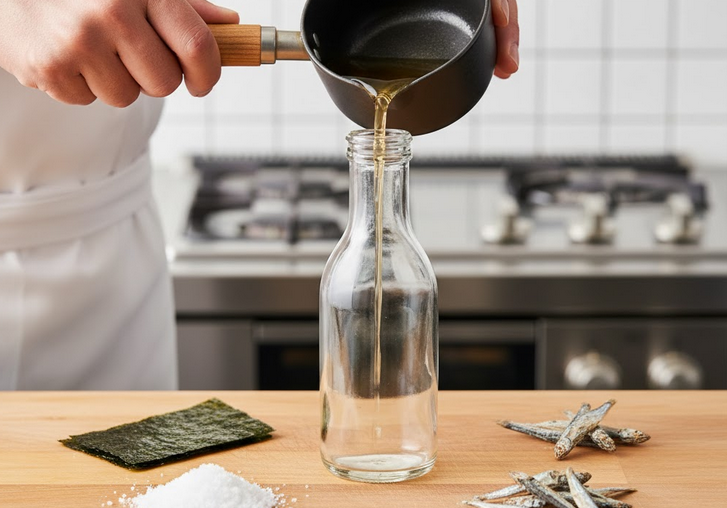 5. 火を止めたアツアツの状態のタレに、旨味のブースト部隊である昆布と煮干しを投入します。こうすることで、余熱でじっくりと、えぐみのない上品な旨味だけがタレに移ります。