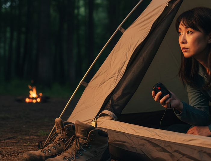 テントの前に、わざと男性用の下着や靴、大きめのアウターなどを置いておき、「一人ではない」「男性がいるかもしれない」と思わせる古典的ですが効果的な手法です。 -