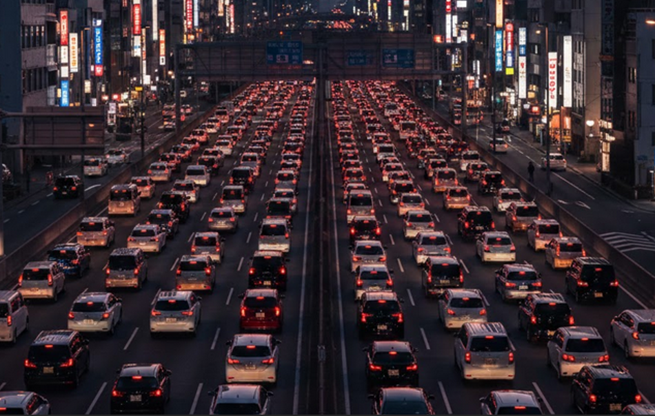 見渡す限り続く、動かない車の列と赤いブレーキランプの海。